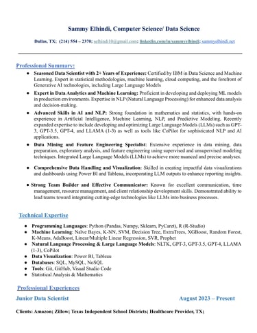 Hello! My name is Sammy Elhindi, and I'm a computer science major at the University of Texas at Dallas. I also have studied and done numerous projects in Data Science. Feel free to look at my resume and portfolio. If you have any questions, please don't hesitate to reach out to me.