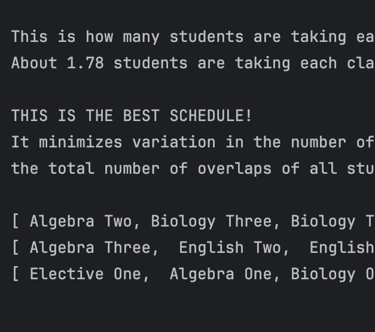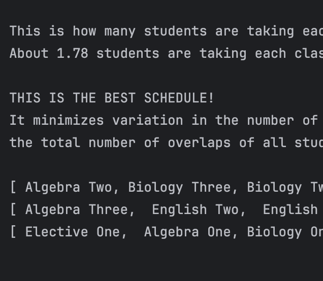 This program reads the classes of students in a data file and generates all the possible permutations of a matrix whose dimensions are determined by the number of periods and classes per period. Then, it creates the best schedule using chi-squared algorithms to minimize variation in the number of students per period and the number of scheduling conflicts where students are enrolled in more than one class in a single period.