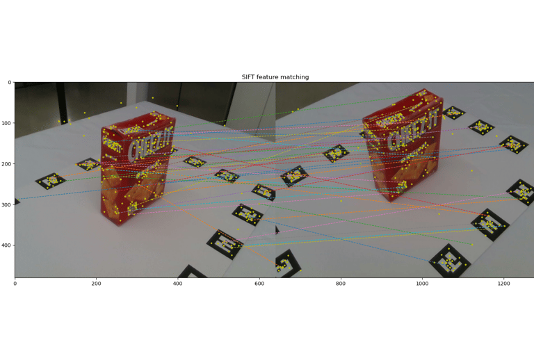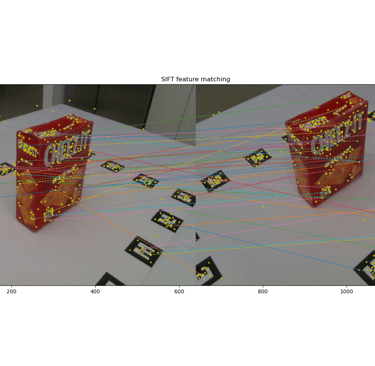 In Computer Vision, I have processed images using linear, bilateral, and non-local means filters. I have detected corners using Harris corner detectors and used SIFT feature matching to relate between two images of an object taken from different angles as seen in the image.