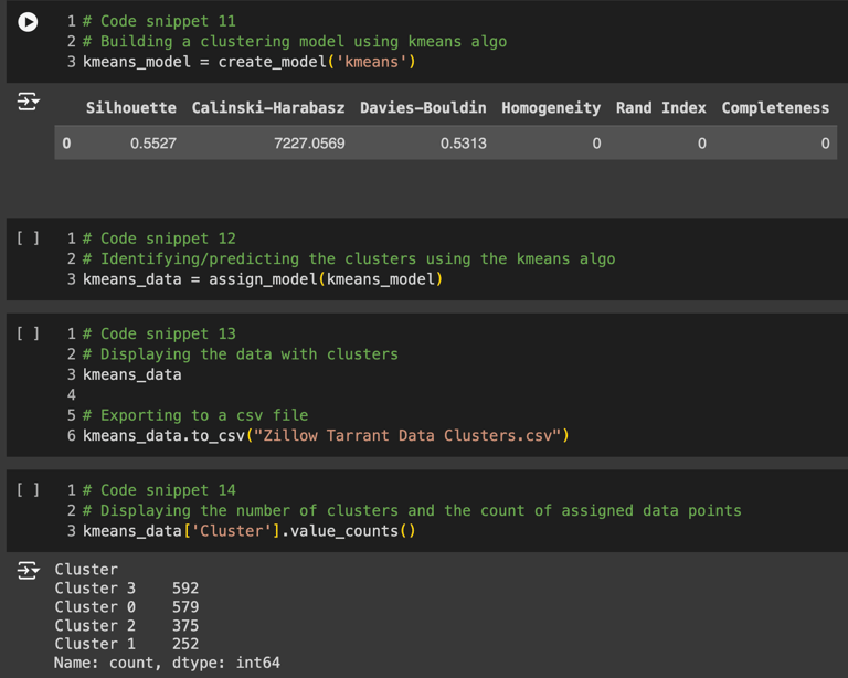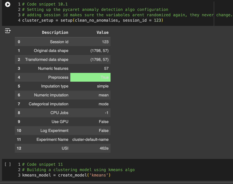 This specific algorithm uses the libraries pycaret and pandas to first identify anomalies with the knn model, then filtering them out to create run a clustering algorithm.